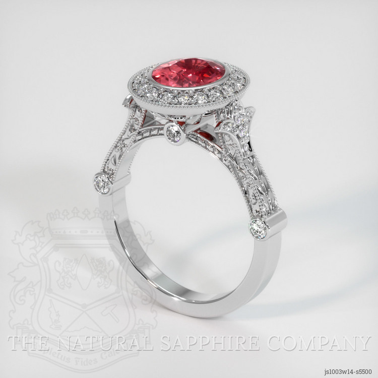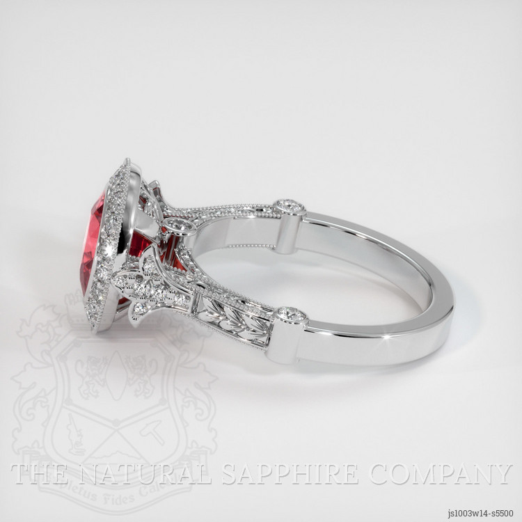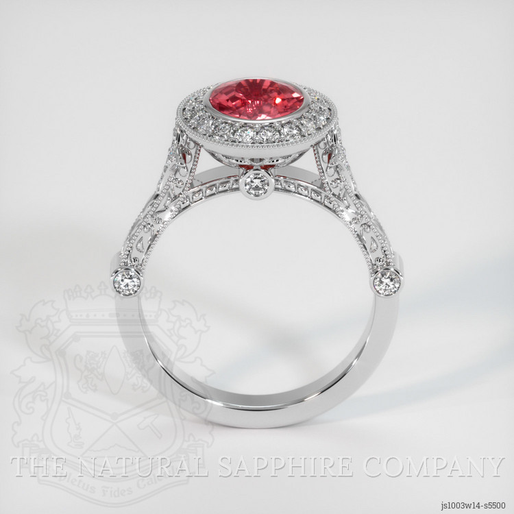 The ring features a beautiful, transparent Other certified Pinkish Orange 2.04 carat oval shape padparadscha sapphire with the dimensions of 8.17 x 7.00 x 4.56 mm and a mixed brilliant cut. It has a clarity grade of very slightly included (evaluated at eye level), vivid color saturation, and an excellent polish. The origin of this sapphire is Mozambique.
