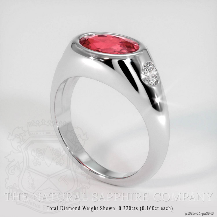 The men's ring features a beautiful, transparent 2.50 carat oval shape padparadscha sapphire with the dimensions of 9.50 x 6.52 x 4.19 mm and a mixed brilliant cut. It has a clarity grade of very slightly included (evaluated at eye level), vivid color saturation, and an excellent polish. The origin of this sapphire is East Africa.
