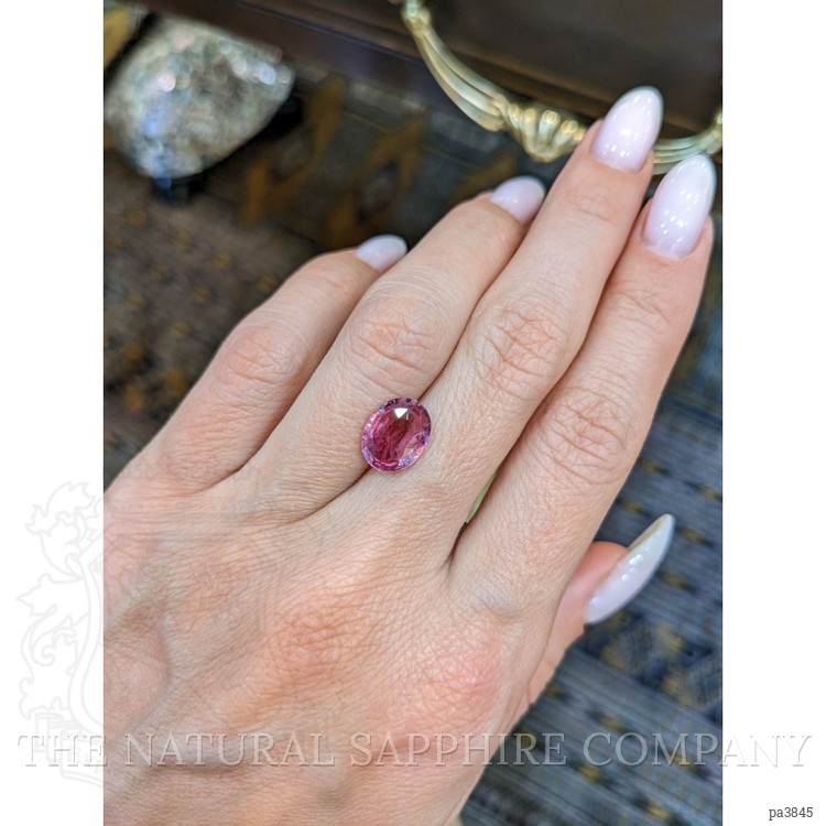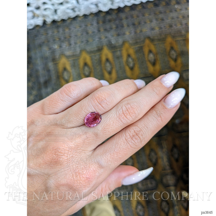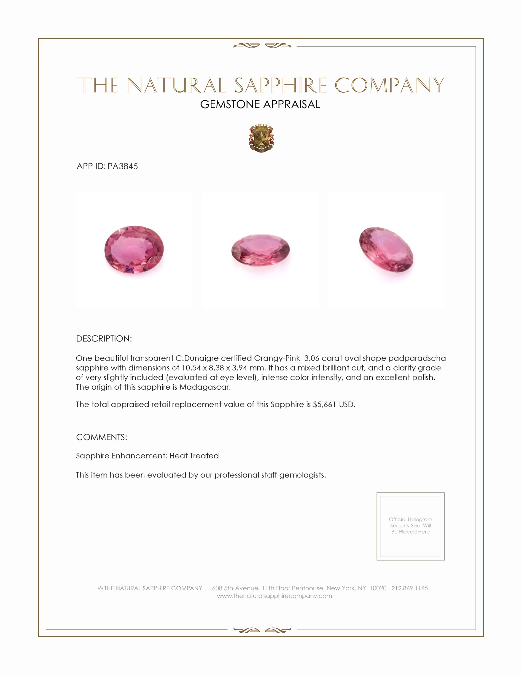 The ring features a beautiful, transparent C.Dunaigre certified Orangy-Pink 3.06 carat oval shape padparadscha sapphire with the dimensions of 10.54 x 8.38 x 3.94 mm and a mixed brilliant cut. It has a clarity grade of very slightly included (evaluated at eye level), intense color saturation, and an excellent polish. The origin of this sapphire is Madagascar.