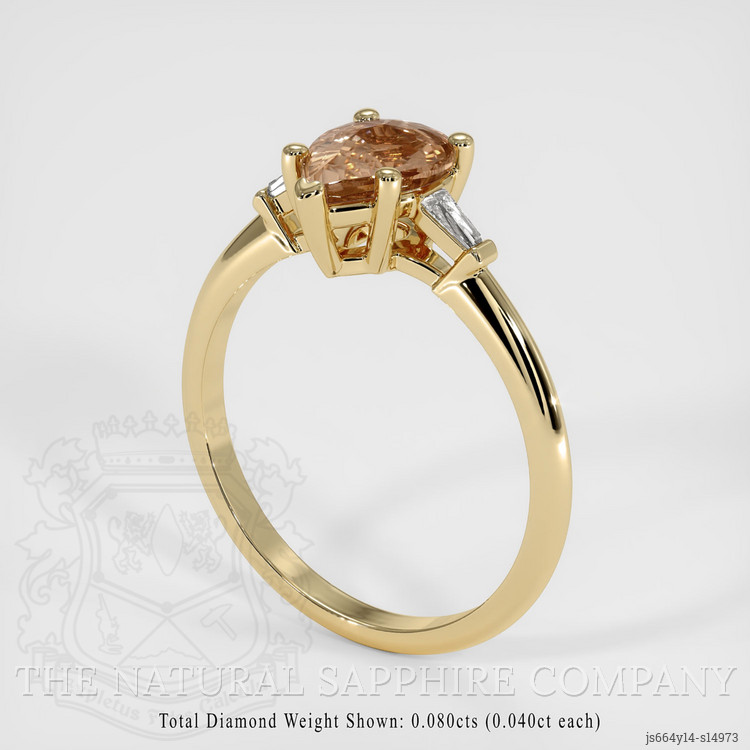 Complementing this enchanting gem are white baguette-shaped diamonds, carefully chosen to enhance the sapphire's splendor. Weighing approximately 0.08 carats and possessing a clarity of VS1 and VS2 with a pristine E color grade, these diamonds emit a crisp brilliance. Their tapered shapes provide an elegant symmetry, framing the sapphire with understated sophistication. Together, they create a harmonious assembly set in lustrous 14K yellow gold, a testament to timeless grace and modern finessed craftsmanship.