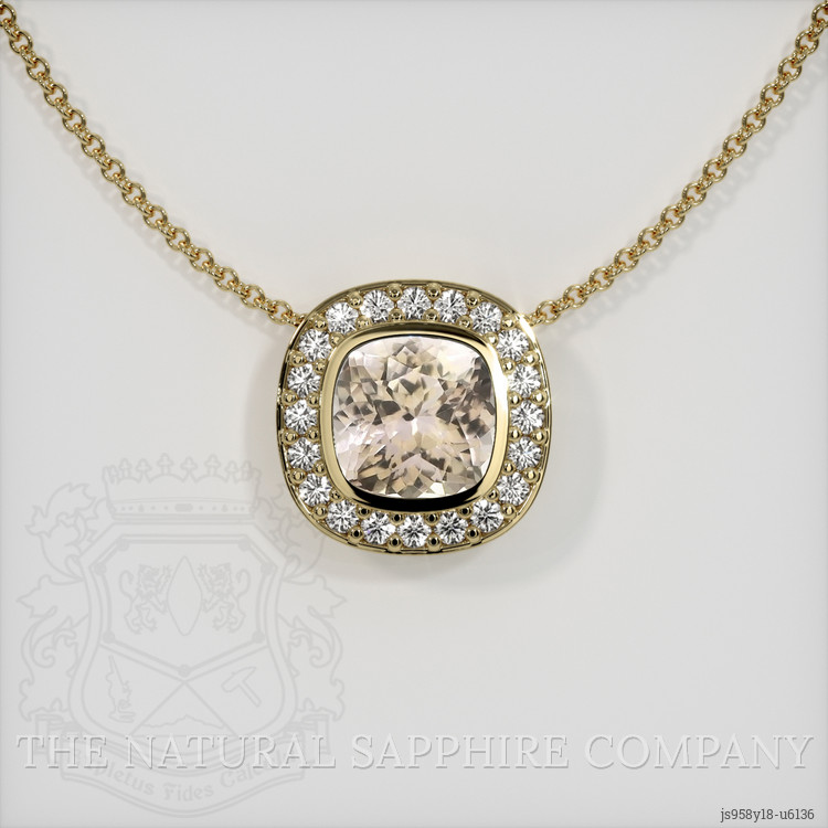 The pendant features a beautiful, transparent 0.74 carat cushion shape peach sapphire with the dimensions of 5.21 x 5.14 x 3.50 mm and a mixed brilliant cut. It has a clarity grade of very slightly included (evaluated at eye level), medium color saturation, and an excellent polish. The origin of this sapphire is Ceylon (Sri Lanka).
