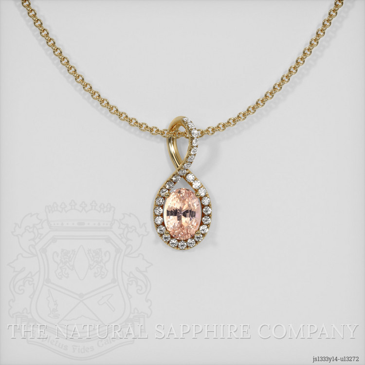The pendant features a beautiful, transparent 2.50 carat oval shape peach sapphire with the dimensions of 8.75 x 6.30 x 5.18 mm and a mixed brilliant cut. It has a clarity grade of eye clean (evaluated at eye level), medium color saturation, and an excellent polish. The origin of this sapphire is Madagascar.