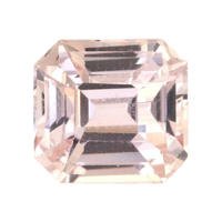 The ring features a beautiful, transparent 4.02 carat emerald cut shape peach sapphire with the dimensions of 8.92 x 8.37 x 5.72 mm and a step cut. It has a clarity grade of eye clean (evaluated at eye level), light color saturation, and an excellent polish. The origin of this sapphire is Madagascar.