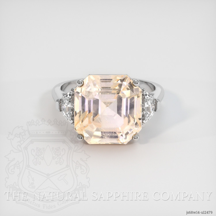 The ring features a beautiful, transparent GIA certified Light Orange 8.27 carat asscher - octagon shape peach sapphire with the dimensions of 10.87 x 10.55 x 7.66 mm and a step cut. It has a clarity grade of very slightly included (evaluated at eye level), light color saturation, and an excellent polish. The origin of this sapphire is Ceylon (Sri Lanka).