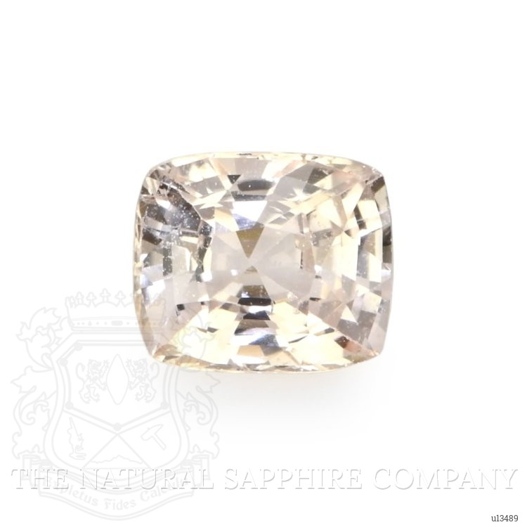 The ring features a beautiful, transparent 2.43 carat cushion shape peach sapphire with the dimensions of 7.99 x 6.76 x 4.92 mm and a mixed brilliant cut. It has a clarity grade of very slightly included (evaluated at eye level), medium light color saturation, and an excellent polish. The origin of this sapphire is Madagascar.