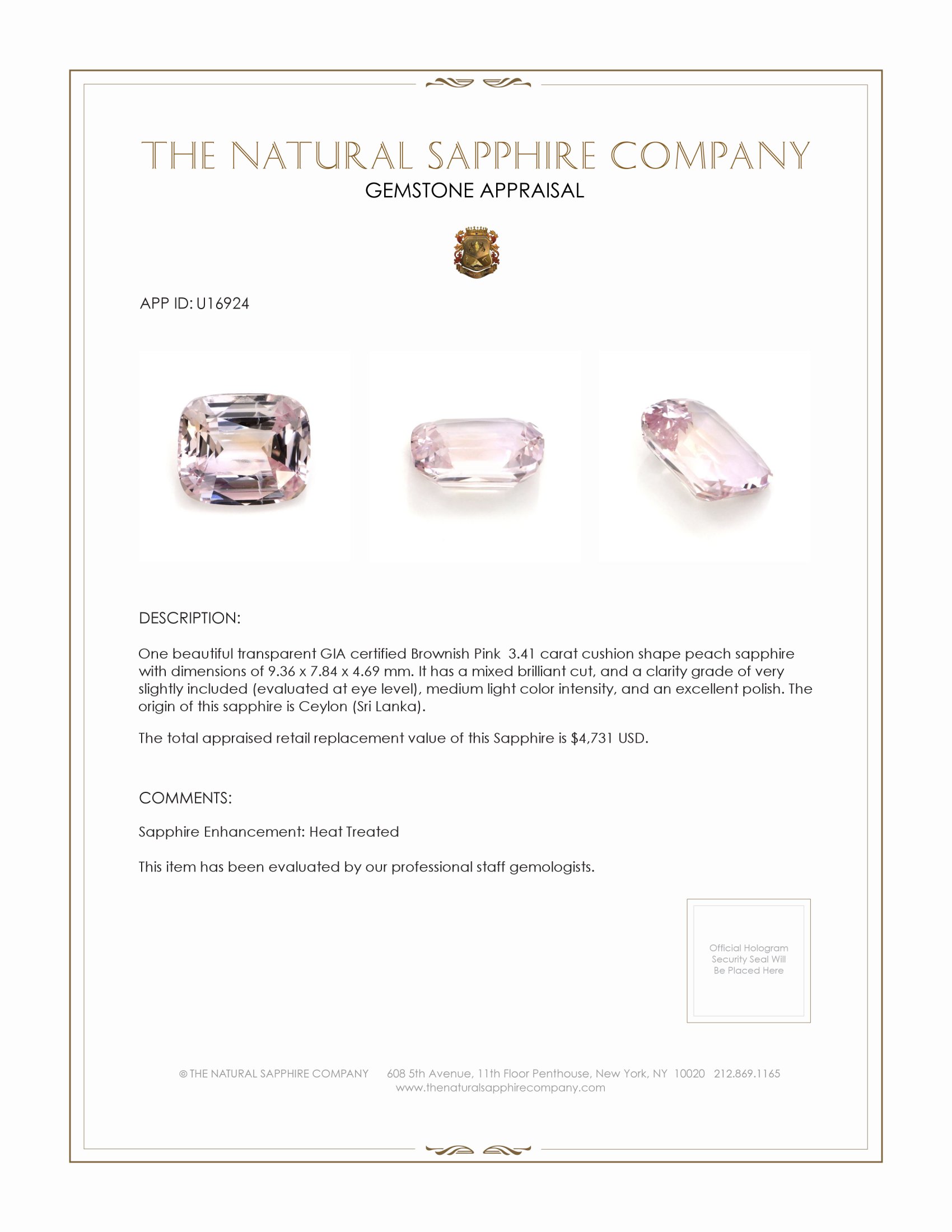 The ring features a beautiful, transparent GIA certified Brownish Pink 3.41 carat cushion shape peach sapphire with the dimensions of 9.36 x 7.84 x 4.69 mm and a mixed brilliant cut. It has a clarity grade of very slightly included (evaluated at eye level), medium light color saturation, and an excellent polish. The origin of this sapphire is Ceylon (Sri Lanka).