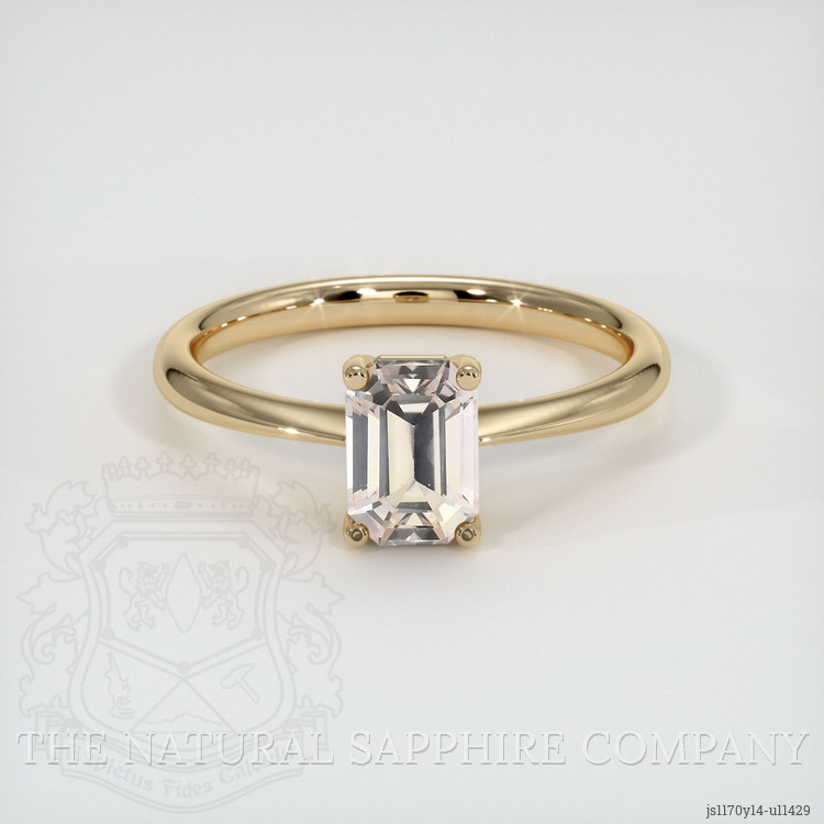 The ring features a beautiful, transparent 1.30 carat emerald cut shape peach sapphire with the dimensions of 7.00 x 4.99 x 3.93 mm and a emerald cut. It has a clarity grade of very slightly included (evaluated at eye level), medium light color saturation, and an excellent polish. The origin of this sapphire is Ceylon (Sri Lanka).