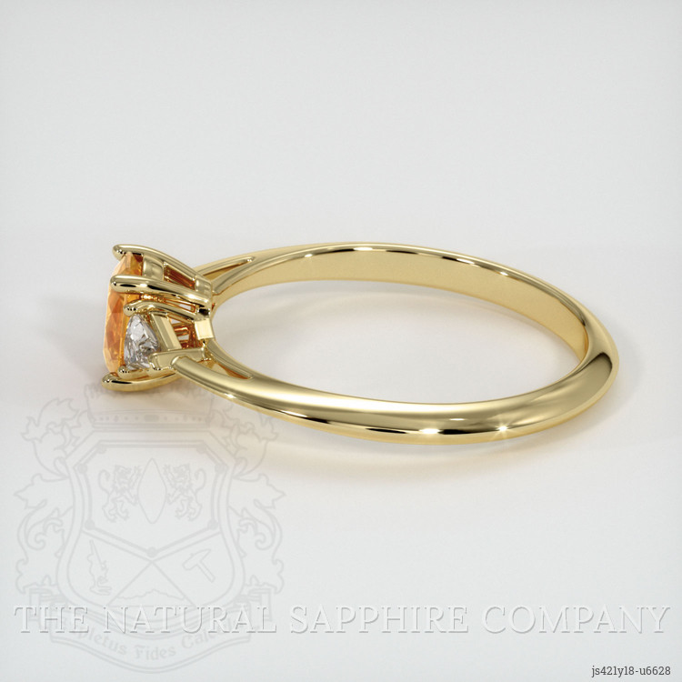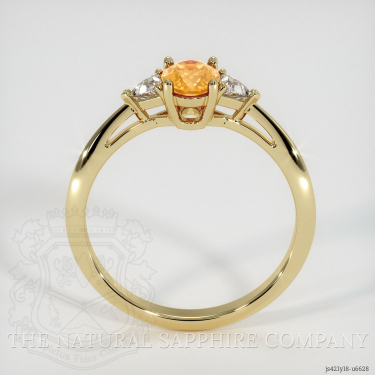 The ring features a beautiful, transparent 0.59 carat oval shape orangish yellow sapphire with the dimensions of 6.30 x 4.79 x 2.92 mm and a mixed brilliant cut. It has a clarity grade of very slightly included (evaluated at eye level), intense color saturation, and an excellent polish. The origin of this sapphire is Montana.