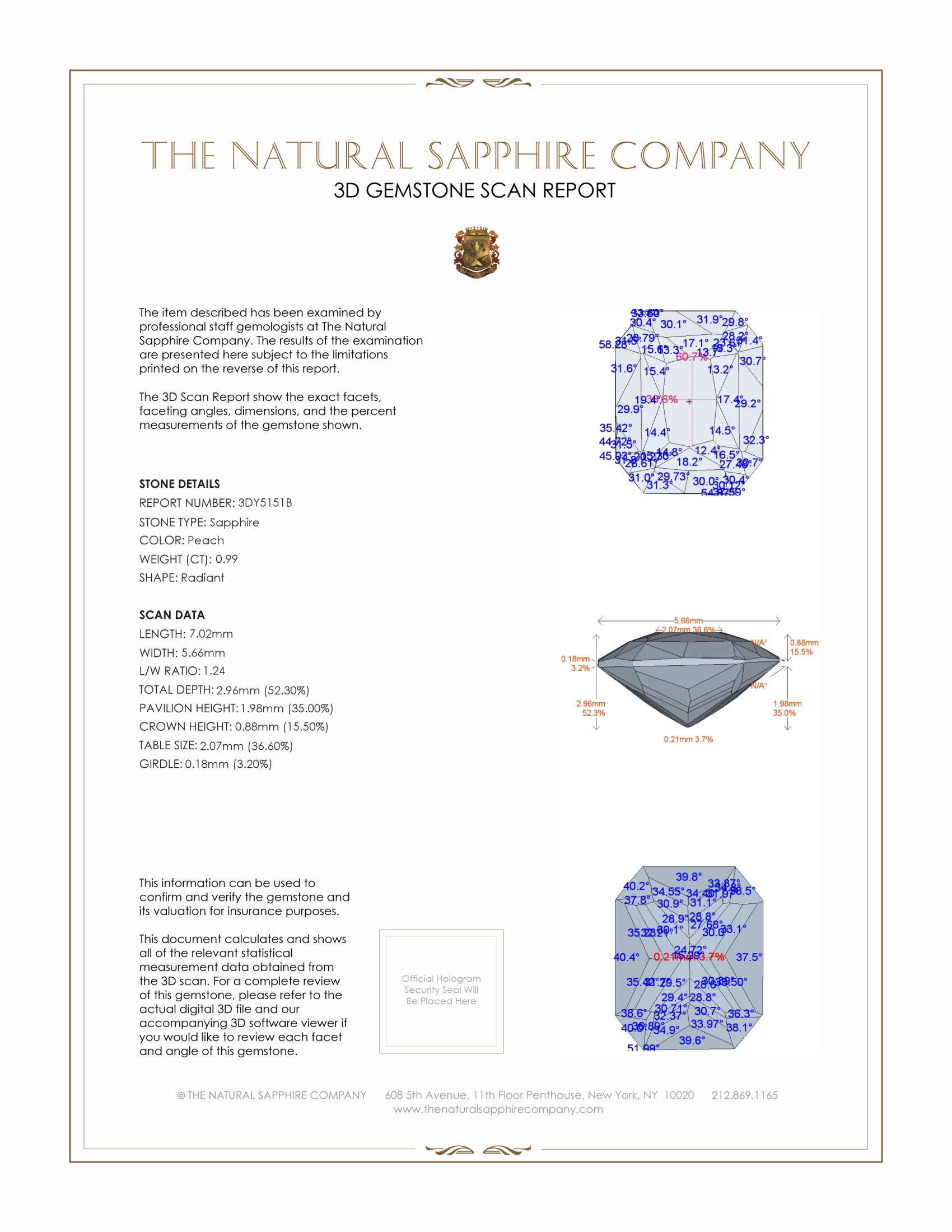 The ring features a beautiful, transparent 0.99 carat radiant shape peach sapphire with the dimensions of 7.02 x 5.66 x 2.96 mm and a radiant cut. It has a clarity grade of very slightly included (evaluated at eye level), medium light color saturation, and an excellent polish. The origin of this sapphire is Ceylon (Sri Lanka).
