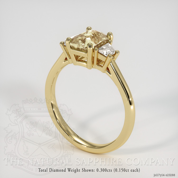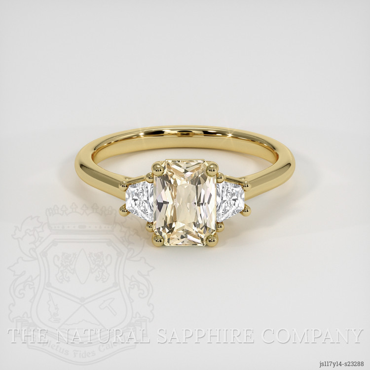 When you are ready to mark a new chapter in life, this ring from The Natural Sapphire Company stands as a gentle and confident promise, a piece that turns hope into a lasting emblem. At its heart lies a transparent 1.68 carat radiant shape peach sapphire, cut to 7.48 x 5.50 x 4.00 mm, its radiant cut designed to reflect both sparkle and warmth. Evaluated at eye level with a clarity grade of very very slightly included, the stone displays a medium light color saturation and an excellent polish. This sapphire is untreated, no enhancement, and its African origin lends a story of distant earth and careful discovery. Flanking the center, white trapezoid shaped natural diamonds, weighing approximately 0.30 carats in total, offer crisp contrast, with clarity grades VS1 and VS2, and a color grade of E. The entire composition rests in 18K yellow gold, a warm metal choice that enhances the peach hue and creates a timeless silhouette.