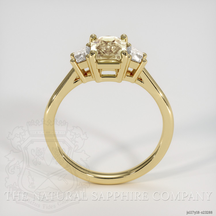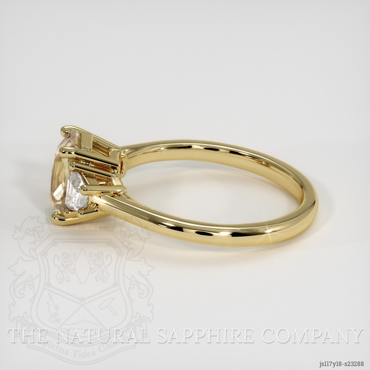 When you are ready to mark a new chapter in life, this ring from The Natural Sapphire Company stands as a gentle and confident promise, a piece that turns hope into a lasting emblem. At its heart lies a transparent 1.68 carat radiant shape peach sapphire, cut to 7.48 x 5.50 x 4.00 mm, its radiant cut designed to reflect both sparkle and warmth. Evaluated at eye level with a clarity grade of very very slightly included, the stone displays a medium light color saturation and an excellent polish. This sapphire is untreated, no enhancement, and its African origin lends a story of distant earth and careful discovery. Flanking the center, white trapezoid shaped natural diamonds, weighing approximately 0.30 carats in total, offer crisp contrast, with clarity grades VS1 and VS2, and a color grade of E. The entire composition rests in 18K yellow gold, a warm metal choice that enhances the peach hue and creates a timeless silhouette.