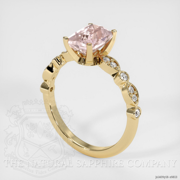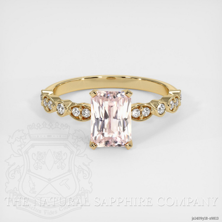 The ring features a beautiful, transparent 2.57 carat radiant shape peach sapphire with the dimensions of 8.29 x 5.88 x 5.00 mm and a radiant cut. It has a clarity grade of eye clean (evaluated at eye level), medium color saturation, and an excellent polish. The origin of this sapphire is Ceylon (Sri Lanka).