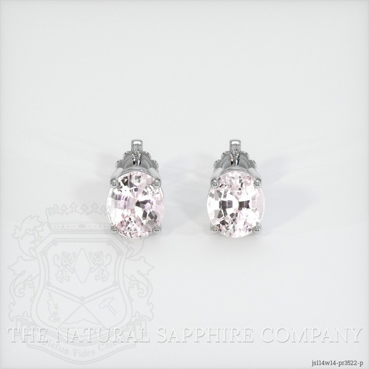 The earrings feature a beautiful, transparent pair of sapphires that are 4.25 total carat weight. They are oval shape pink sapphires, with the dimensions of 7.56 x 6.50 x 5.29 mm and are mixed brilliant cut, have a clarity grade of very slightly included (evaluated at eye level), faint color saturation, and an excellent polish. The origin of this pair of sapphires is Ceylon (Sri Lanka).