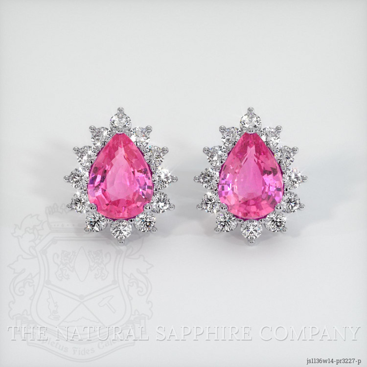 The earrings feature a beautiful, transparent pair of sapphires that are 2.22 total carat weight. They are pear shape pink sapphires, with the dimensions of 8.00 x 5.87 x 3.47 mm and are mixed brilliant cut, have a clarity grade of very slightly included (evaluated at eye level), intense color saturation, and an excellent polish. The origin of this pair of sapphires is Ceylon (Sri Lanka).