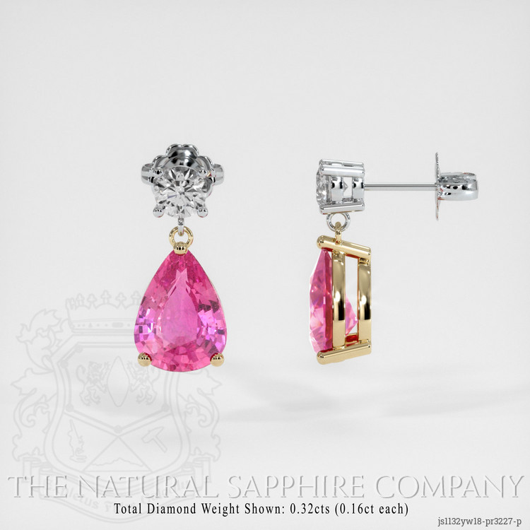 The earrings feature a beautiful, transparent pair of sapphires that are 2.22 total carat weight. They are pear shape pink sapphires, with the dimensions of 8.00 x 5.87 x 3.47 mm and are mixed brilliant cut, have a clarity grade of very slightly included (evaluated at eye level), intense color saturation, and an excellent polish. The origin of this pair of sapphires is Ceylon (Sri Lanka).