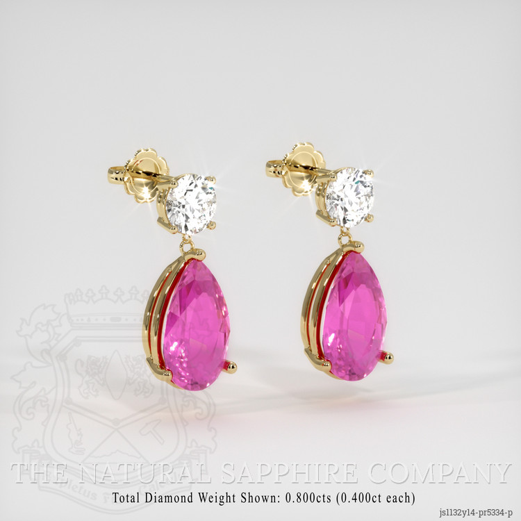 The earrings feature a beautiful, transparent Other certified pair of sapphires that are 4.08 total carat weight. They are pear shape pink sapphires, with the dimensions of 10.78 x 6.64 x 3.44 mm and are mixed brilliant cut, have a clarity grade of very slightly included (evaluated at eye level), medium intense color saturation, and an excellent polish. The origin of this pair of sapphires is Ceylon (Sri Lanka).