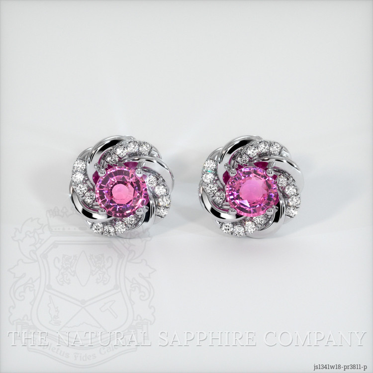 The earrings feature a beautiful, transparent Other certified pair of sapphires that are 3.48 total carat weight. They are round shape pink sapphires, with the dimensions of 7.56 x 7.51 x 3.84 mm and are mixed brilliant cut, have a clarity grade of very slightly included (evaluated at eye level), intense color saturation, and an excellent polish. The origin of this pair of sapphires is Ceylon (Sri Lanka).