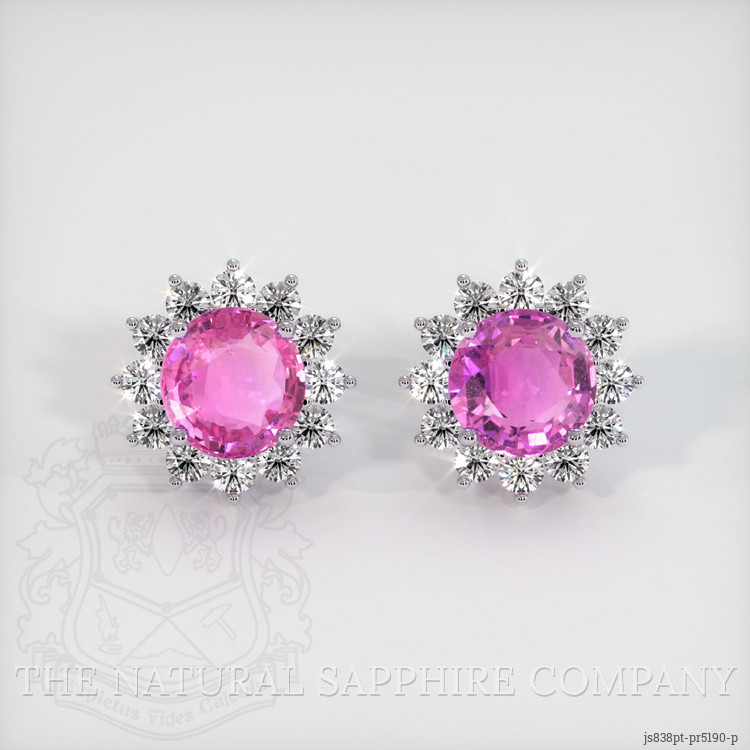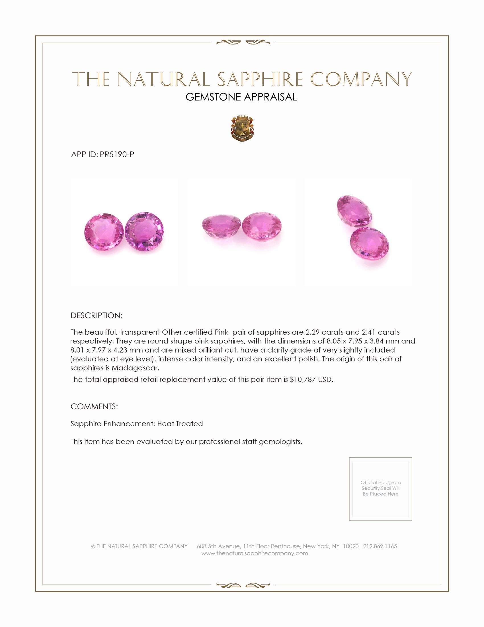 The earrings feature a beautiful, transparent Other certified pair of sapphires that are 4.70 total carat weight. They are round shape pink sapphires, with the dimensions of 8.01 x 7.97 x 4.23 mm and are mixed brilliant cut, have a clarity grade of very slightly included (evaluated at eye level), intense color saturation, and an excellent polish. The origin of this pair of sapphires is Madagascar.