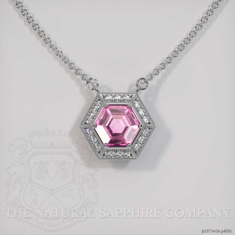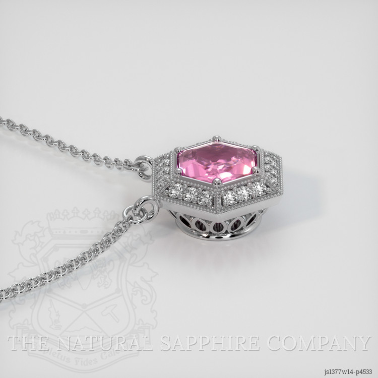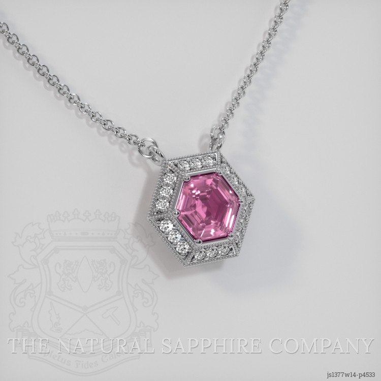 The pendant features a beautiful, transparent 1.64 carat fancy shape pink sapphire with the dimensions of 8.16 x 7.07 x 3.62 mm and a step cut. It has a clarity grade of very slightly included (evaluated at eye level), intense color saturation, and an excellent polish. The origin of this sapphire is Ceylon(Sri Lanka).