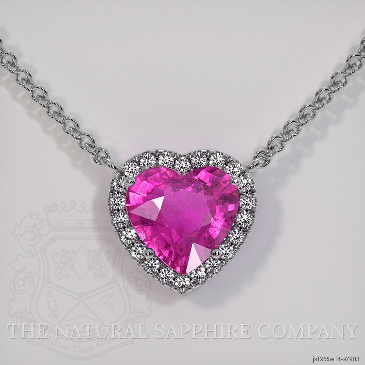 This exquisite necklace is a masterpiece of craftsmanship, entirely set in 14K white gold. At the heart of this magnificent piece lies a transparent 3.11 carat heart-shaped pink sapphire, boasting precise dimensions of 9.05 x 9.52 x 4.77 mm. The sapphire is meticulously cut in a mixed brilliant style, enhancing its brilliance and fire. Its clarity grade is very slightly included, evaluated at eye level, which ensures that only minimal inclusions are visible to the naked eye. The stone's intense color saturation is a hallmark of high-quality gemstones, and its excellent polish further highlights its lustrous appearance. The origin of this sapphire is the renowned gemstone region of Ceylon, now known as Sri Lanka, which is celebrated for producing sapphires of exceptional quality and beauty.
