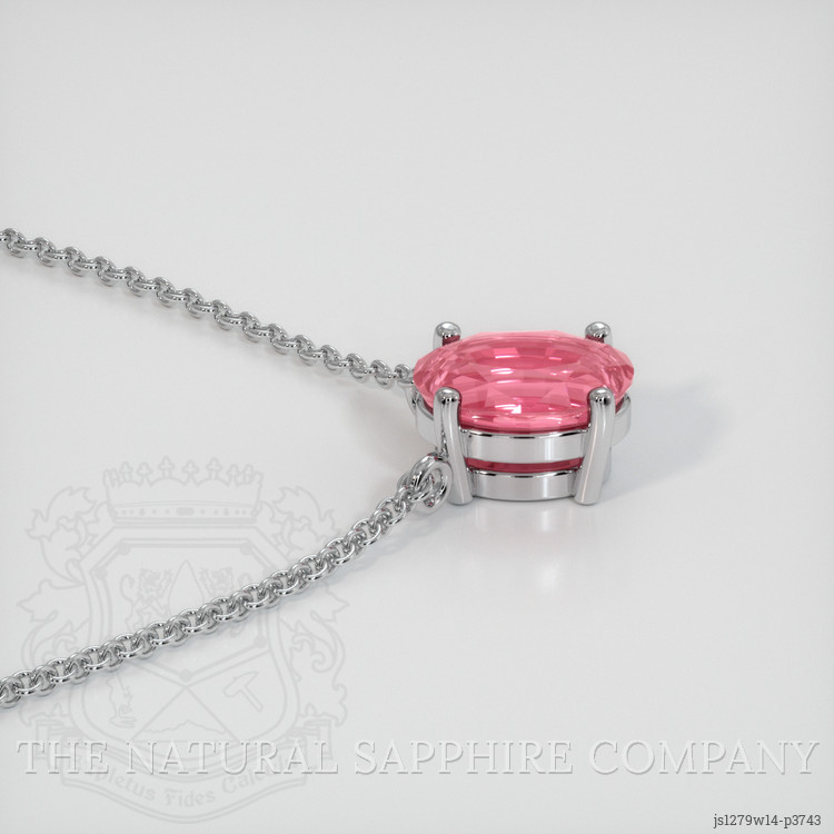 The necklace features a beautiful, transparent 0.89 carat oval shape pink sapphire with the dimensions of 6.49 x 4.59 x 3.71 mm and a mixed brilliant cut. It has a clarity grade of very slightly included (evaluated at eye level), medium intense color saturation, and an excellent polish. The origin of this sapphire is Ceylon (Sri Lanka).