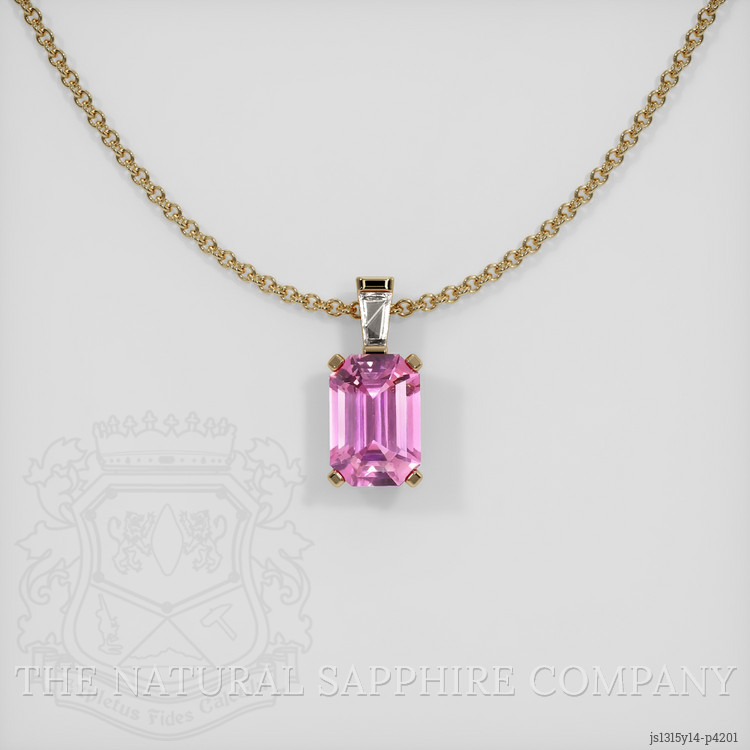 The pendant features a beautiful, transparent 0.69 carat emerald cut shape pink sapphire with the dimensions of 5.91 x 4.07 x 3.05 mm and a emerald cut. It has a clarity grade of slightly included (evaluated at eye level), medium color saturation, and an excellent polish. The origin of this sapphire is Ceylon (Sri Lanka).