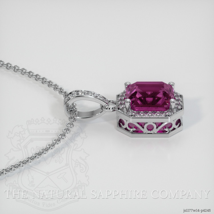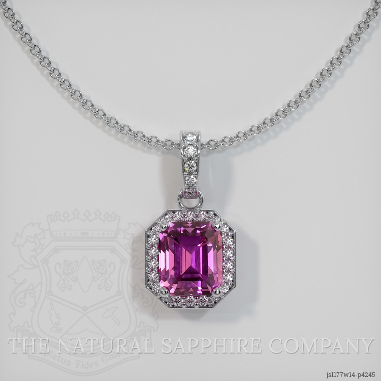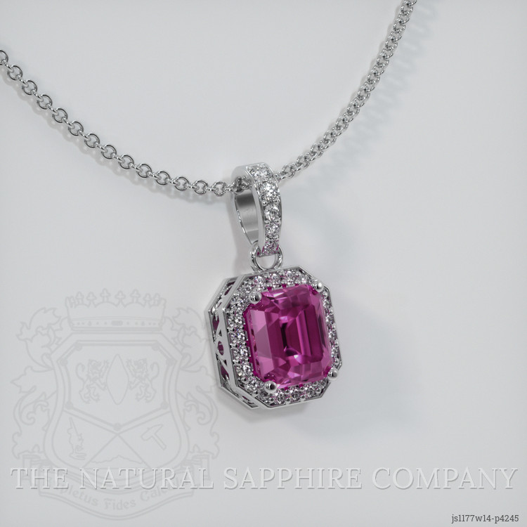 The pendant features a beautiful, transparent 1.14 carat emerald cut shape pink sapphire with the dimensions of 5.78 x 4.93 x 4.16 mm and a emerald cut. It has a clarity grade of very slightly included (evaluated at eye level), intense color saturation, and an excellent polish. The origin of this sapphire is Ceylon (Sri Lanka).