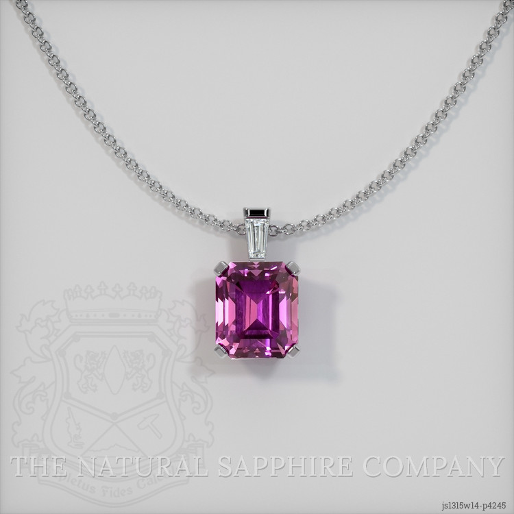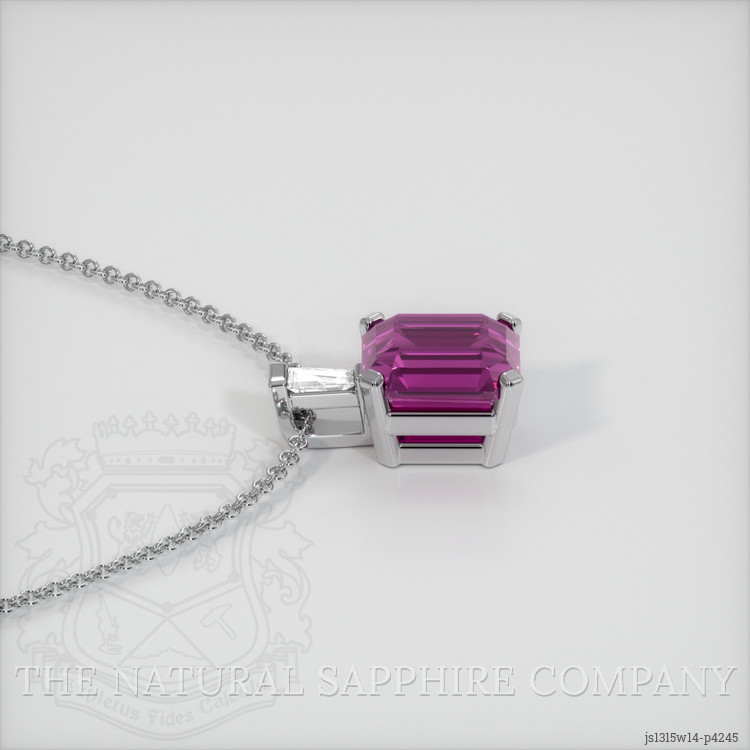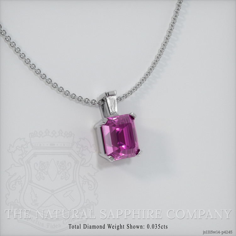 The pendant features a beautiful, transparent 1.14 carat emerald cut shape pink sapphire with the dimensions of 5.78 x 4.93 x 4.16 mm and a emerald cut. It has a clarity grade of very slightly included (evaluated at eye level), intense color saturation, and an excellent polish. The origin of this sapphire is Ceylon (Sri Lanka).
