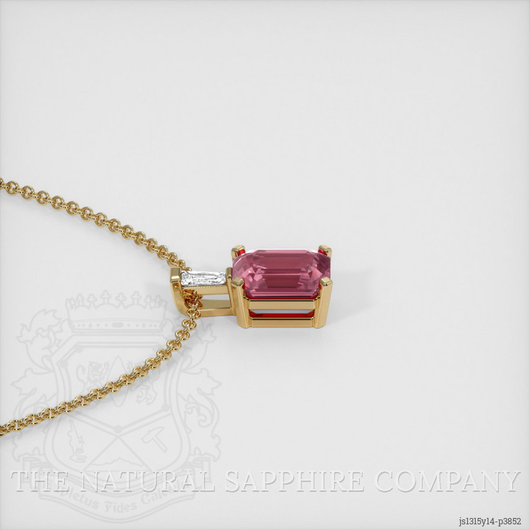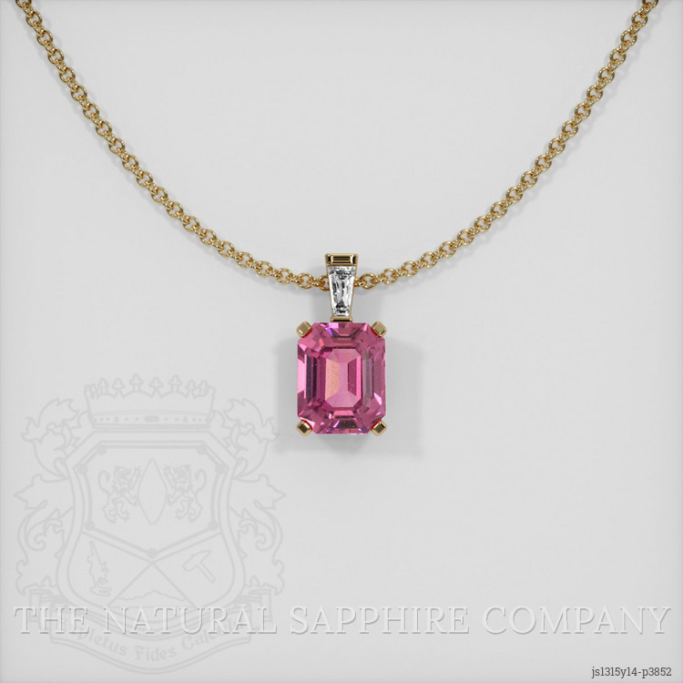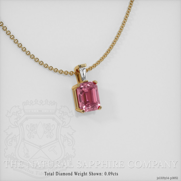 The pendant features a beautiful, transparent 2.08 carat emerald cut shape pink sapphire with the dimensions of 7.80 x 6.20 x 4.35 mm and a emerald cut. It has a clarity grade of very slightly included (evaluated at eye level), intense color saturation, and an excellent polish. The origin of this sapphire is Ceylon (Sri Lanka).