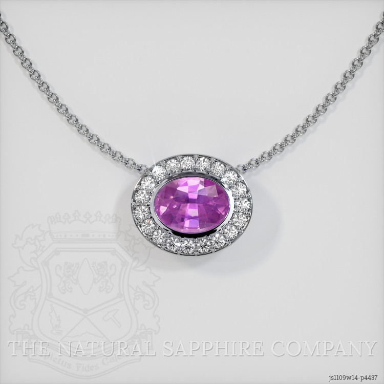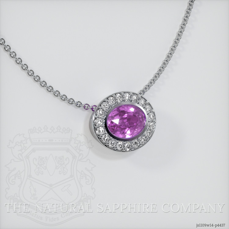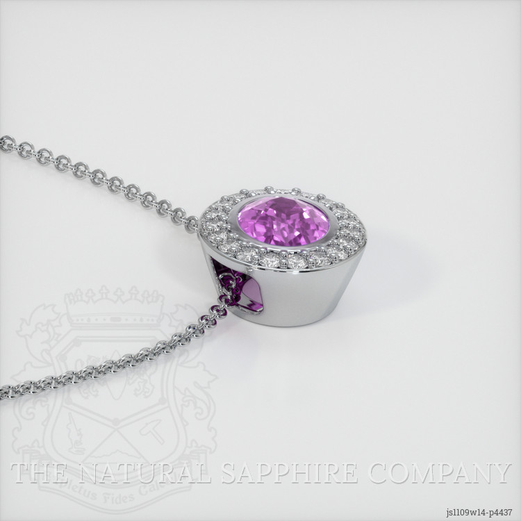 The pendant features a beautiful, transparent 0.70 carat oval shape pink sapphire with the dimensions of 6.30 x 4.59 x 3.04 mm and a mixed brilliant cut. It has a clarity grade of very slightly included (evaluated at eye level), intense color saturation, and an excellent polish. The origin of this sapphire is Ceylon (Sri Lanka).