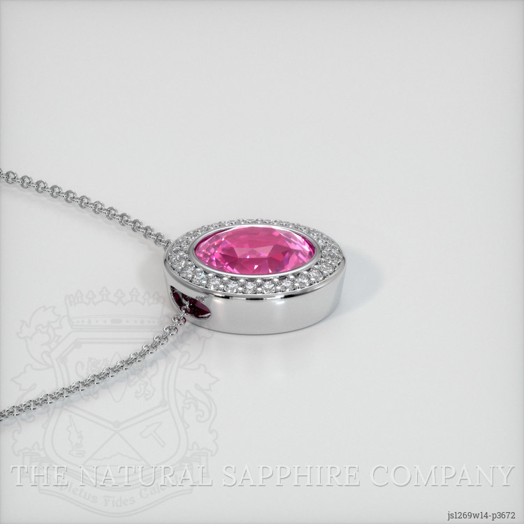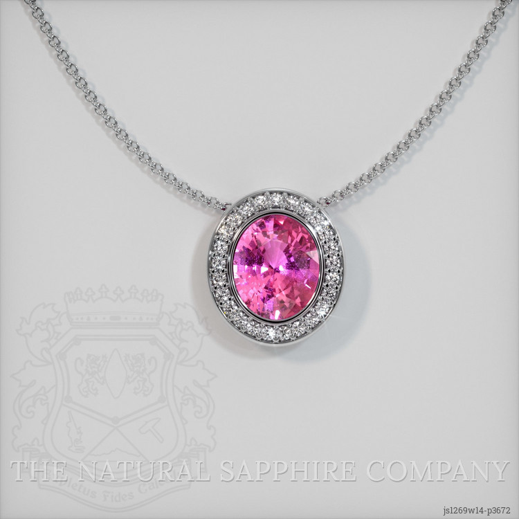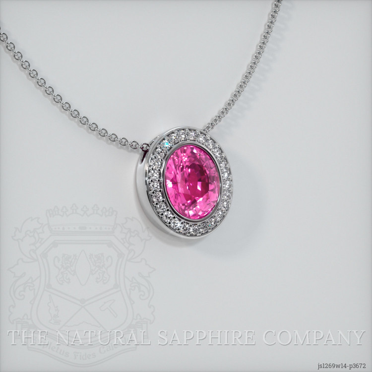 The pendant features a beautiful, transparent 2.21 carat oval shape pink sapphire with the dimensions of 8.44 x 6.86 x 4.82 mm and a mixed brilliant cut. It has a clarity grade of very slightly included (evaluated at eye level), intense color saturation, and an excellent polish. The origin of this sapphire is Ceylon (Sri Lanka).