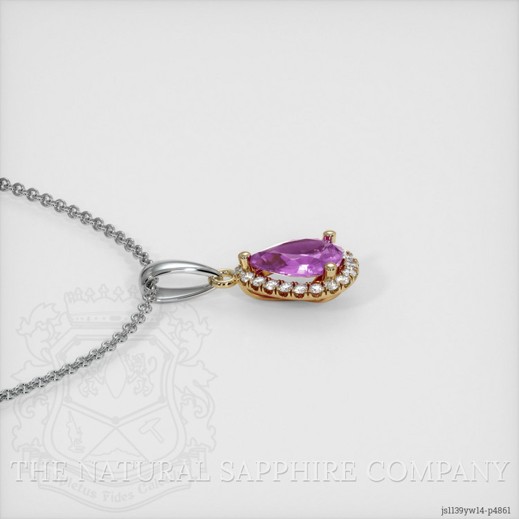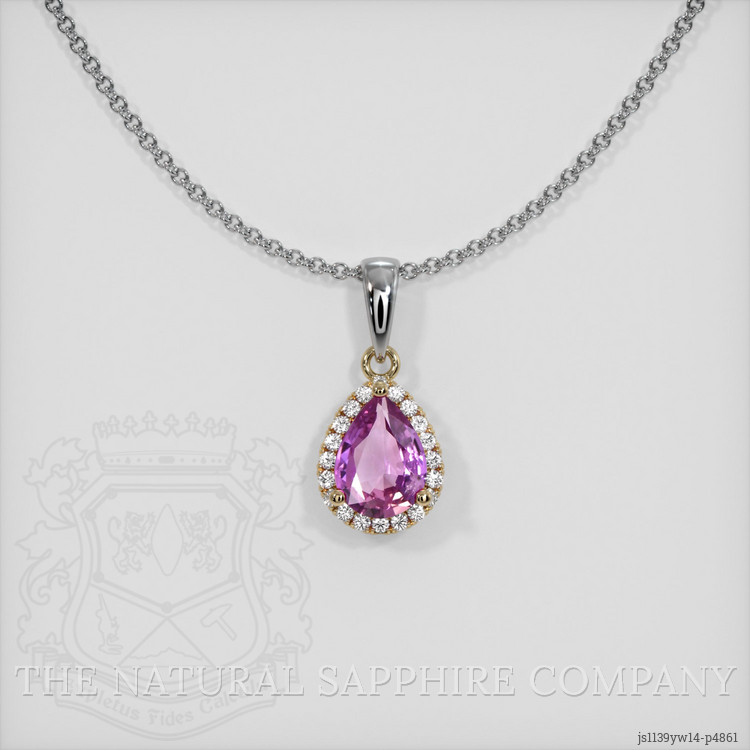 The pendant features a beautiful, transparent 0.81 carat pear shape pink sapphire with the dimensions of 7.43 x 5.46 x 2.72 mm and a mixed brilliant cut. It has a clarity grade of very slightly included (evaluated at eye level), intense color saturation, and an excellent polish. The origin of this sapphire is Ceylon (Sri Lanka).