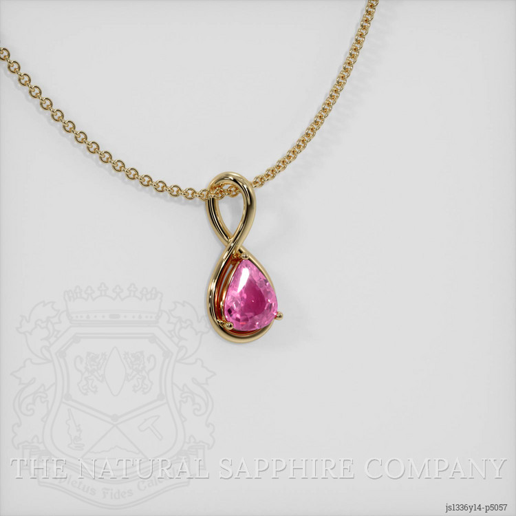 The pendant features a beautiful, transparent 1.21 carat pear shape pink sapphire with the dimensions of 7.84 x 6.53 x 3.13 mm and a mixed brilliant cut. It has a clarity grade of very slightly included (evaluated at eye level), medium intense color saturation, and an excellent polish. The origin of this sapphire is Ceylon (Sri Lanka).