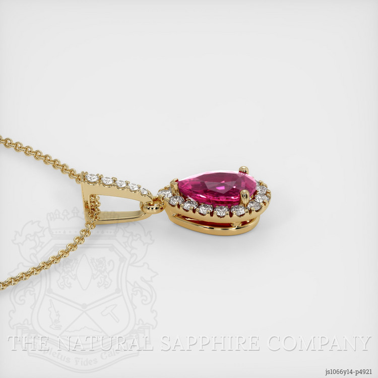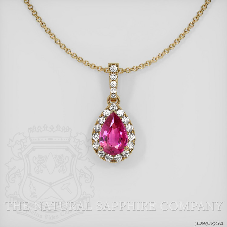 The pendant features a beautiful, transparent 1.25 carat pear shape pink sapphire with the dimensions of 8.46 x 5.58 x 3.50 mm and a mixed brilliant cut. It has a clarity grade of eye clean (evaluated at eye level), vivid color saturation, and an excellent polish. The origin of this sapphire is Ceylon (Sri Lanka).
