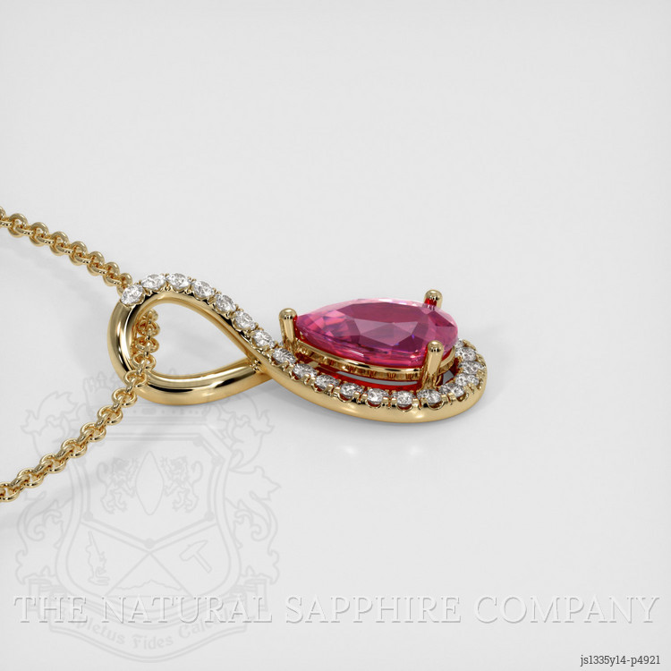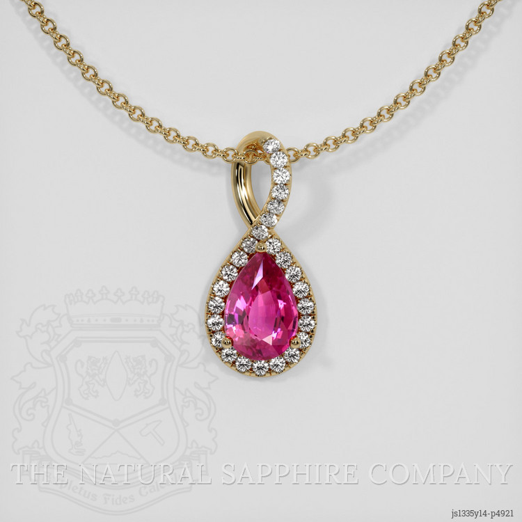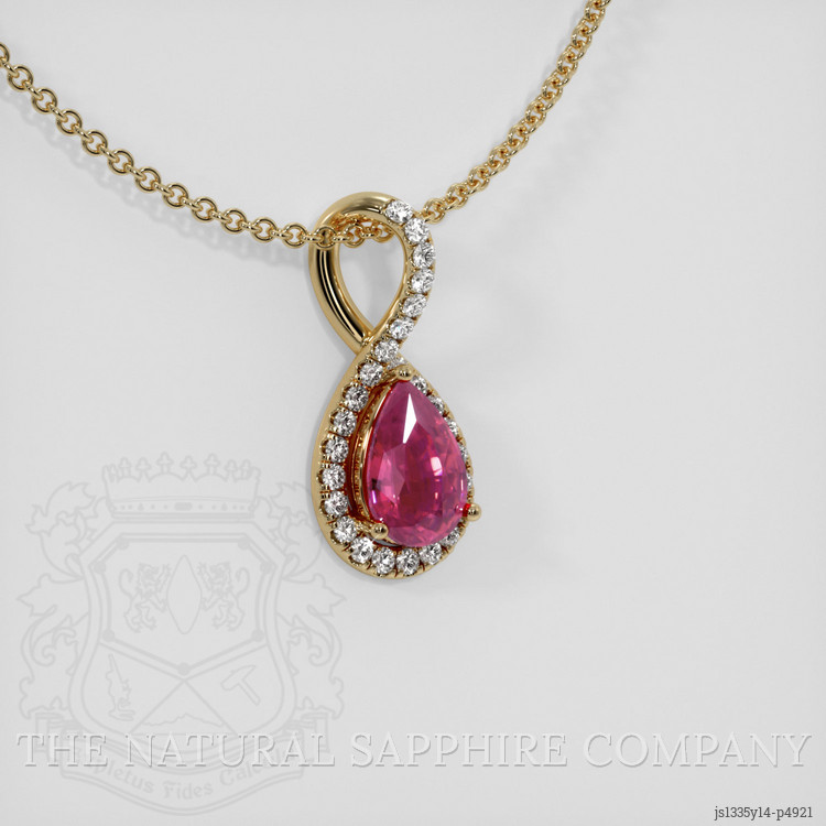 The pendant features a beautiful, transparent 1.25 carat pear shape pink sapphire with the dimensions of 8.46 x 5.58 x 3.50 mm and a mixed brilliant cut. It has a clarity grade of eye clean (evaluated at eye level), vivid color saturation, and an excellent polish. The origin of this sapphire is Ceylon (Sri Lanka).