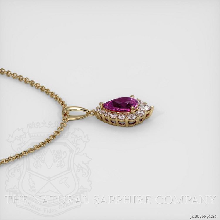 The pendant features a beautiful, transparent 1.79 carat pear shape pink sapphire with the dimensions of 8.79 x 6.02 x 4.57 mm and a mixed brilliant cut. It has a clarity grade of very slightly included (evaluated at eye level), vivid color saturation, and an excellent polish. The origin of this sapphire is Ceylon.