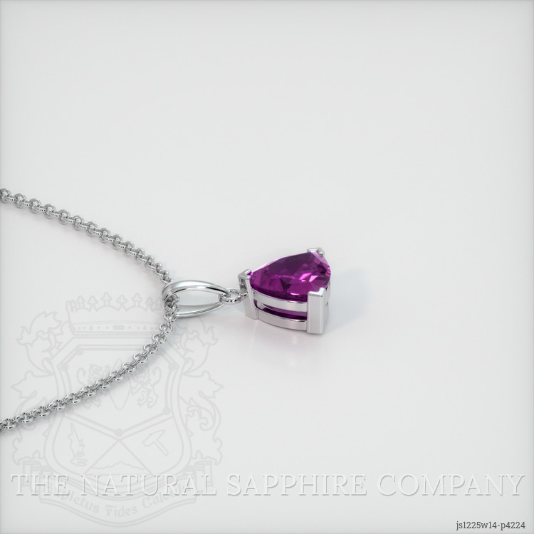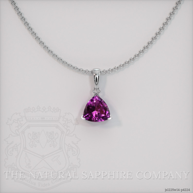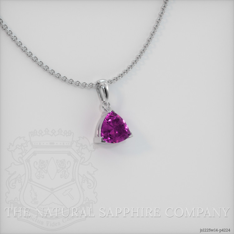 The pendant features a beautiful, transparent 0.73 carat trillion shape pink sapphire with the dimensions of 6.02 x 5.99 x 3.11 mm and a trillion cut. It has a clarity grade of very slightly included (evaluated at eye level), vivid color saturation, and an excellent polish. The origin of this sapphire is Ceylon (Sri Lanka).