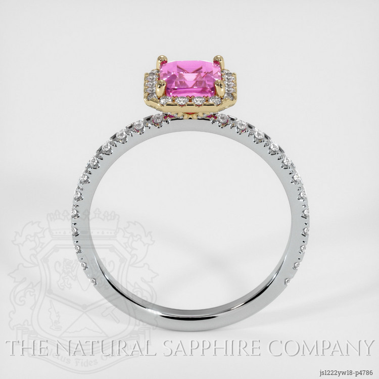 The ring features a beautiful, transparent GIA certified Purple-Pink 1.04 carat asscher shape pink sapphire with the dimensions of 5.72 x 4.98 x 3.60 mm and a asscher cut. It has a clarity grade of very slightly included (evaluated at eye level), intense color saturation, and an excellent polish. The origin of this sapphire is Madagascar.