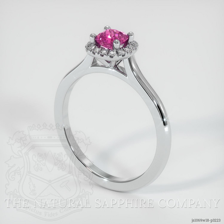 The ring features a beautiful, transparent 0.44 carat cushion shape pink sapphire with the dimensions of 4.32 x 4.26 x 3.01 mm and a mixed brilliant cut. It has a clarity grade of eye clean (evaluated at eye level), vivid color saturation, and an excellent polish. The origin of this sapphire is Ceylon (Sri Lanka).