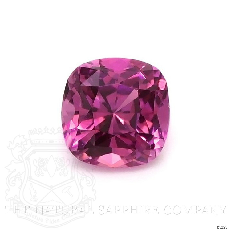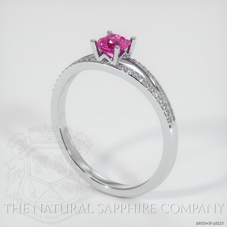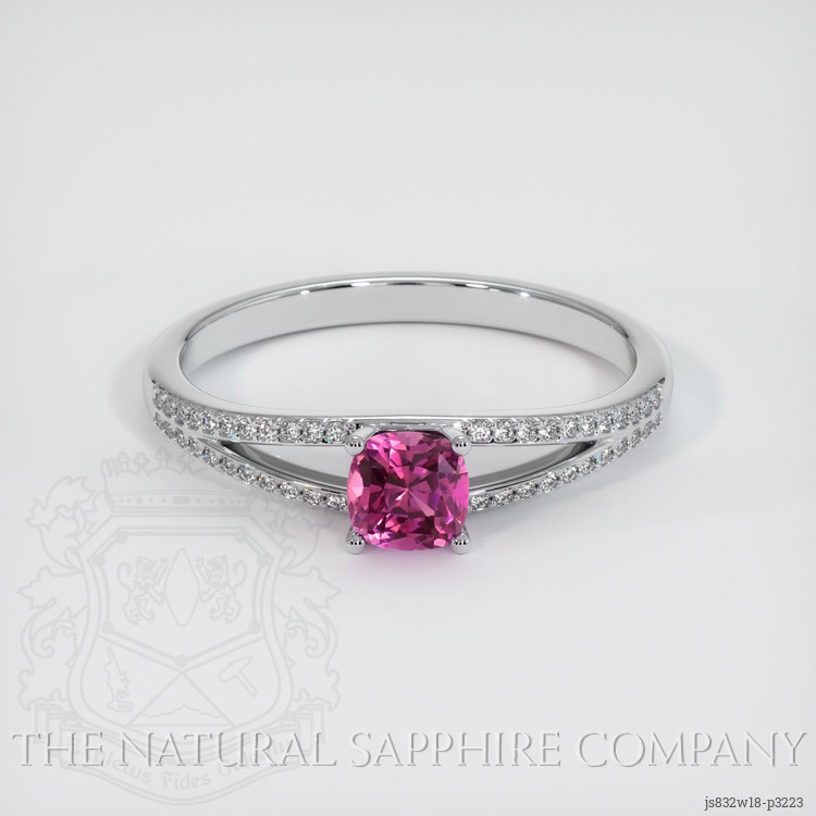 The ring features a beautiful, transparent 0.44 carat cushion shape pink sapphire with the dimensions of 4.32 x 4.26 x 3.01 mm and a mixed brilliant cut. It has a clarity grade of eye clean (evaluated at eye level), vivid color saturation, and an excellent polish. The origin of this sapphire is Ceylon (Sri Lanka).