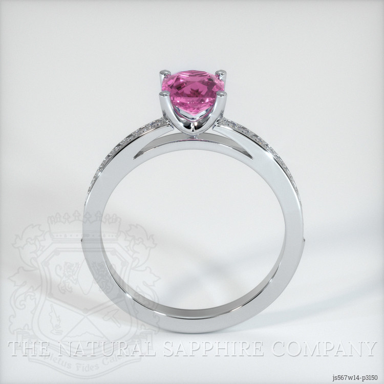 The ring features a beautiful, transparent 0.68 carat cushion shape pink sapphire with the dimensions of 5.17 x 5.12 x 3.43 mm and a mixed brilliant cut. It has a clarity grade of very slightly included (evaluated at eye level), medium intense color saturation, and an excellent polish. The origin of this sapphire is Ceylon (Sri Lanka).