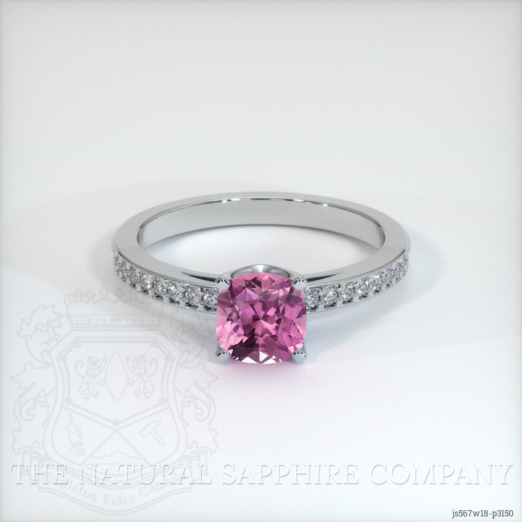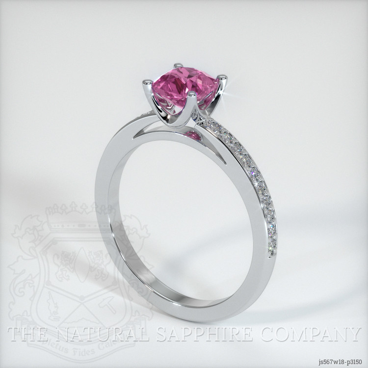 The ring features a beautiful, transparent 0.68 carat cushion shape pink sapphire with the dimensions of 5.17 x 5.12 x 3.43 mm and a mixed brilliant cut. It has a clarity grade of very slightly included (evaluated at eye level), medium intense color saturation, and an excellent polish. The origin of this sapphire is Ceylon (Sri Lanka).