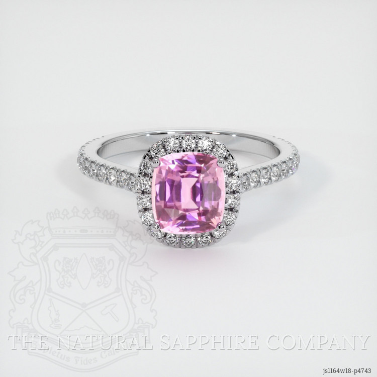 The ring features a beautiful, transparent 1.11 carat cushion shape pink sapphire with the dimensions of 6.19 x 5.50 x 3.55 mm and a mixed brilliant cut. It has a clarity grade of very slightly included (evaluated at eye level), medium intense color saturation, and an excellent polish. The origin of this sapphire is Ceylon (Sri Lanka).