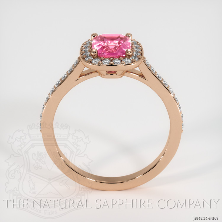 The ring features a beautiful, transparent 1.19 carat cushion shape pink sapphire with the dimensions of 6.57 x 5.44 x 3.56 mm and a mixed brilliant cut. It has a clarity grade of eye clean (evaluated at eye level), intense color saturation, and an excellent polish. The origin of this sapphire is Ceylon (Sri Lanka).