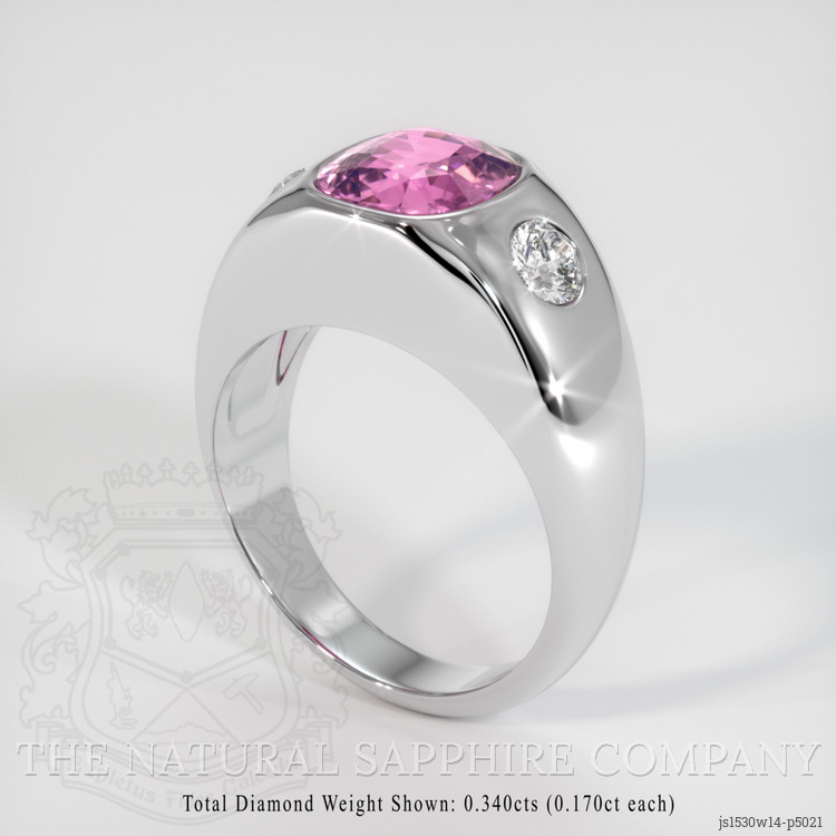 The men's ring features a beautiful, transparent 2.08 carat cushion shape pink sapphire with the dimensions of 7.92 x 7.32 x 4.02 mm and a mixed brilliant cut. It has a clarity grade of very slightly included (evaluated at eye level), medium intense color saturation, and an excellent polish. The origin of this sapphire is Ceylon (Sri Lanka).