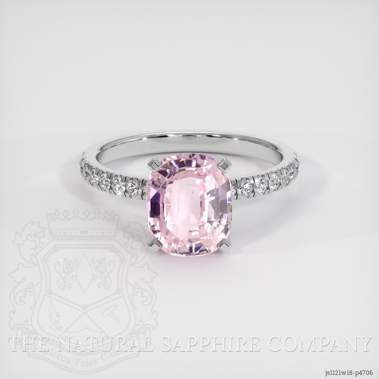 The ring features a beautiful, transparent GIA certified Purple-Pink 3.07 carat cushion shape pink sapphire with the dimensions of 8.68 x 7.21 x 4.88 mm and a mixed brilliant cut. It has a clarity grade of very slightly included (evaluated at eye level), medium light color saturation, and an excellent polish. The origin of this sapphire is Madagascar.