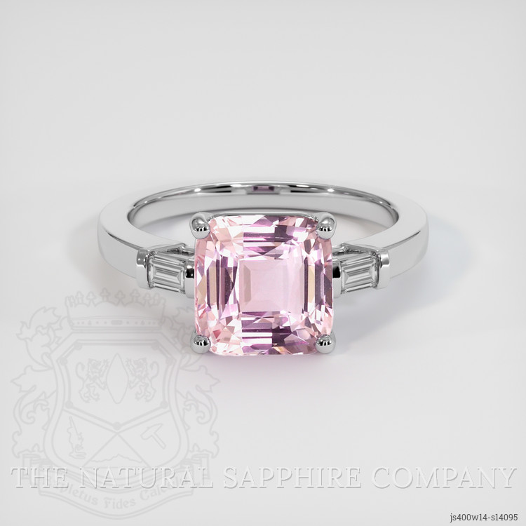 The gem's splendor is accentuated by white baguette-shaped natural diamonds, collectively weighing approximately 0.20 carats. These diamonds boast a clarity grade of VS1 to VS2, ensuring minimal inclusions that might hinder the flow of light through these stones. Coupled with a prestigious E color grade, they are nearly colorless, imparting a timeless elegance to the overall aesthetics. The exquisite craftsmanship evident in the setting is a hallmark of diligent artistry, ensuring that each element of the design is both functional and ornamental. The excellent polish on these diamonds enhances their light performance, creating an interplay of sparkle that complements the serene pink hue of the sapphire.