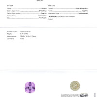 The ring features a beautiful, transparent GIA certified Pink-Purple 6.64 carat cushion shape pink sapphire with the dimensions of 10.62 x 10.22 x 6.80 mm and a mixed brilliant cut. It has a clarity grade of very slightly included (evaluated at eye level), medium light color saturation, and an excellent polish. The origin of this sapphire is Ceylon (Sri Lanka).