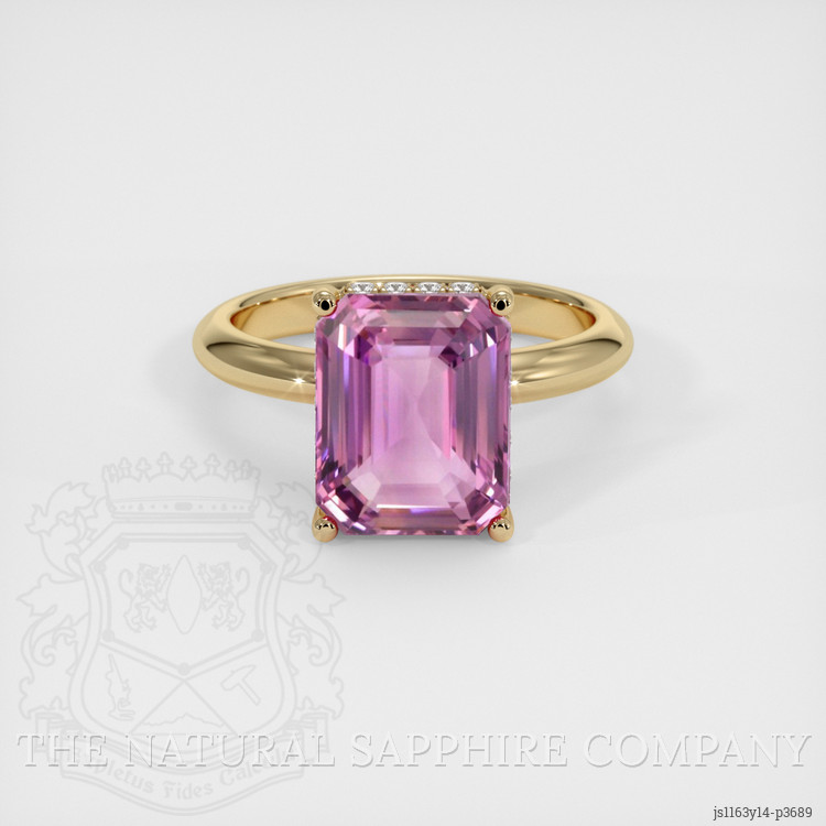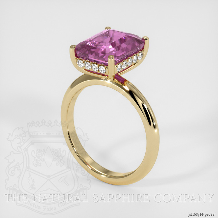 The ring features a beautiful, transparent 6.02 carat emerald cut shape pink sapphire with the dimensions of 10.96 x 8.66 x 5.61 mm and a emerald cut. It has a clarity grade of eye clean (evaluated at eye level), medium color saturation, and an excellent polish. The origin of this sapphire is Madagascar.