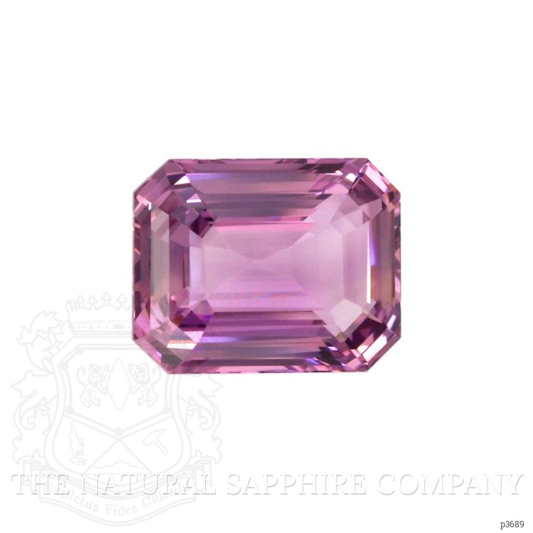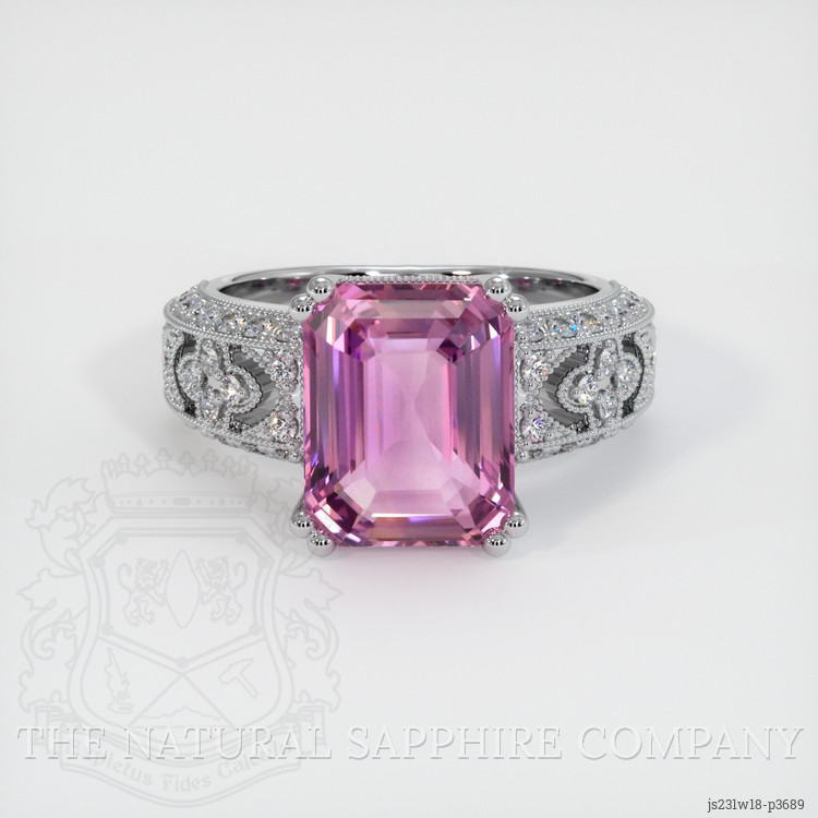 The ring features a beautiful, transparent 6.02 carat emerald cut shape pink sapphire with the dimensions of 10.96 x 8.66 x 5.61 mm and a emerald cut. It has a clarity grade of eye clean (evaluated at eye level), medium color saturation, and an excellent polish. The origin of this sapphire is Madagascar.